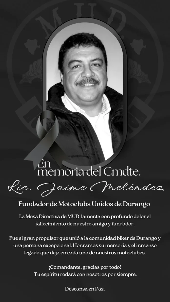 La comunidad motociclista de Durango se encuentra de luto tras el fallecimiento de Jaime Meléndez Castillo, un reconocido integrante de varios motoclubes, quien perdió la vida la noche del miércoles 24 de septiembre en un accidente ocurrido sobre el Periférico Norte, a la altura del poblado La Tinaja.